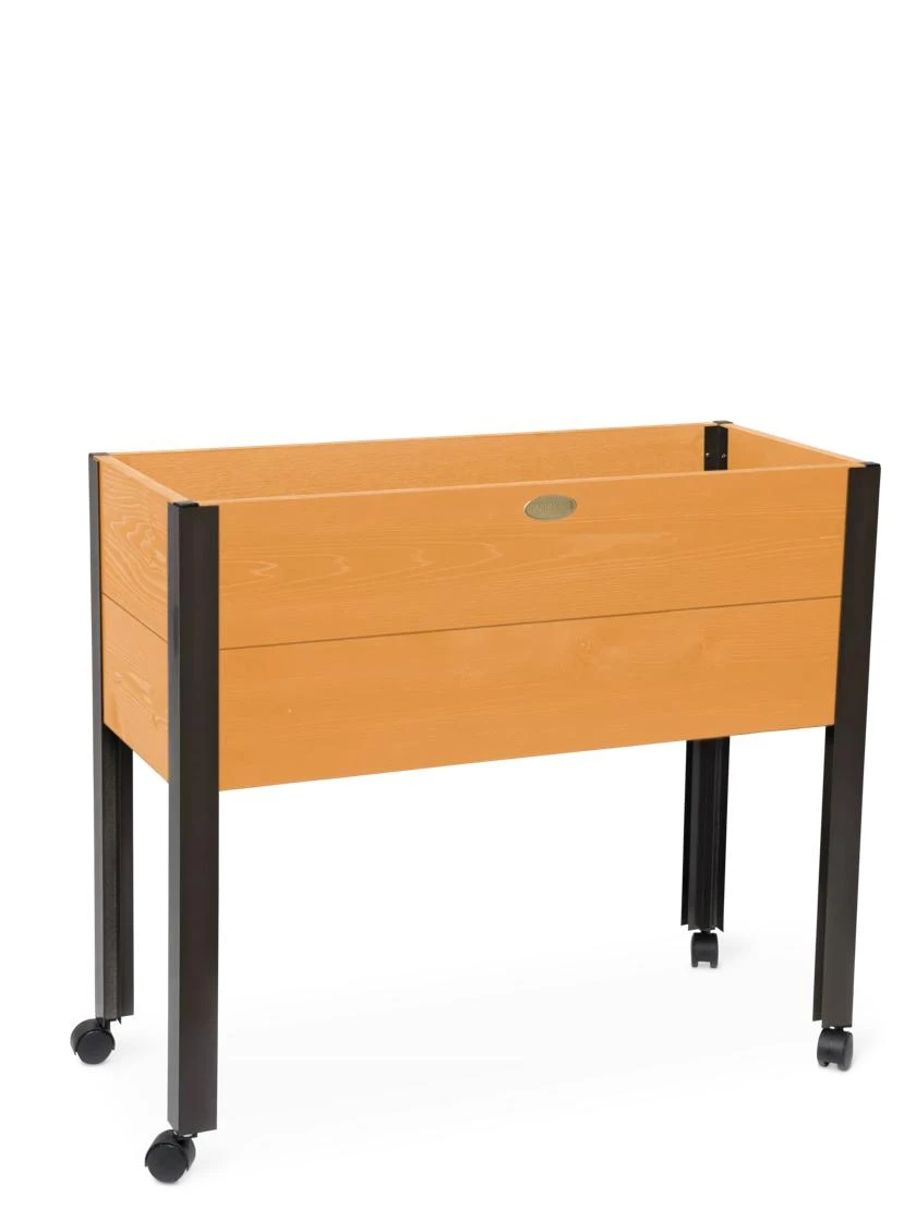 Grow an abundance of food and flowers in a compact space. This lovely planter box is made of rot-resistant wood, coated with eco-friendly, food-safe PolyWhey® stain. It features our signature lifetime aluminum legs, and casters make it easy to roll around on your deck or patio. With a 10.5″ planting depth, this garden box is perfect for herbs, veggies, edible flowers, or an entire salsa garden. No-bend gardening is easier on your back and knees, and you’ll have fewer weeds to deal with too!