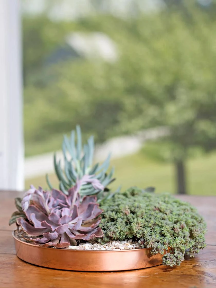 - Handsome copper tray dresses up potted plants and protects surfaces